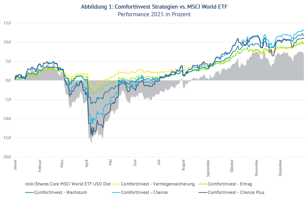 Dass dieser Ansatz wirkt, zeigen die Ergebnisse: Alle klassischen Strategien erzielten 2025 eine deutliche Outperformance gegenüber dem MSCI World. Selbst die sehr defensive Strategie „Vermögenssicherung“ schlug mit +9,4 Prozent den, nicht gerade defensiven, „iShares Core MSCI World ETF“ mit +6,8 Prozent (Abbildung 1). Schaut man auf die direkte Morningstar Vergleichsgruppe „Mischfonds EUR defensiv Global“ fiel die Outperformance mit +9,4 Prozent gegenüber +3,9 Prozent sogar noch deutlicher aus.