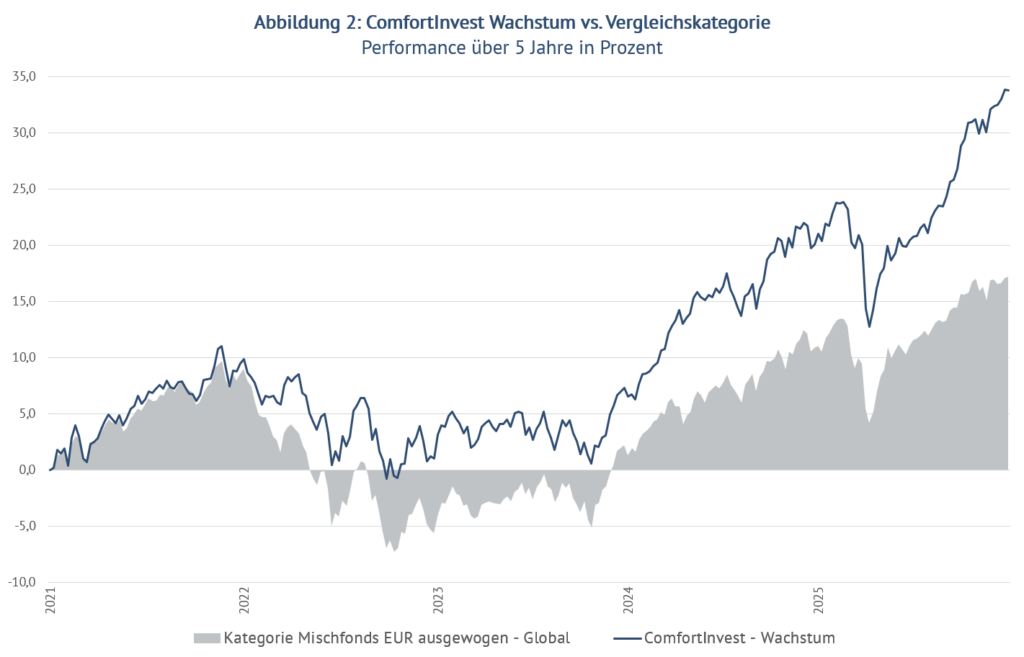 Besonders beliebt nach Anlagevolumen sind die Strategien „Wachstum“ und „Chance“, die für balancierte und offensivere, jedoch gleichzeitig breit diversifizierte Portfolios stehen. Werfen wir beispielsweise einen Blick auf die Performance der Strategie „Wachstum“ (Abbildung 2) zeigt sich auch über einen Zeitraum von fünf Jahren eine doppelt so hohe Performance (+33,8 Prozent) gegenüber der Vergleichskategorie (+17,2 Prozent).